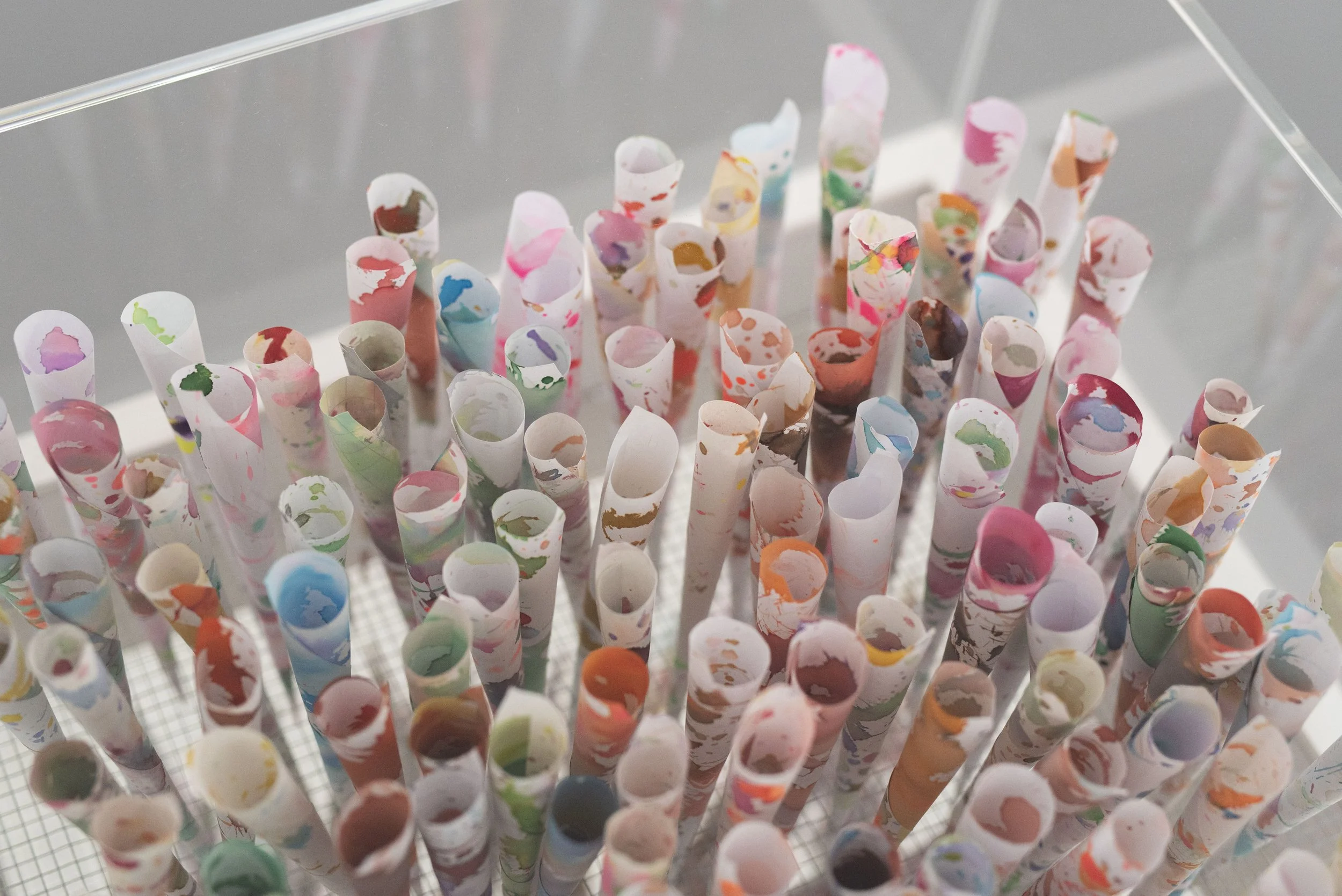 Iginio Iurilli beherrscht diese Art der Irritation gleichermaßen. Einige seiner Keramikarbeiten wirken durch den Auftrag eines intensiven Kreidepigments wie Filzstoffinstallationen, andere wirken wie Keramik, sind aber aus sogenanntem ‚Composto‘ aufgebaut. Das Verfahren ähnelt der Herstellung von gekleisterten Buntpapierlampions mit Hilfe eines Luftballons.